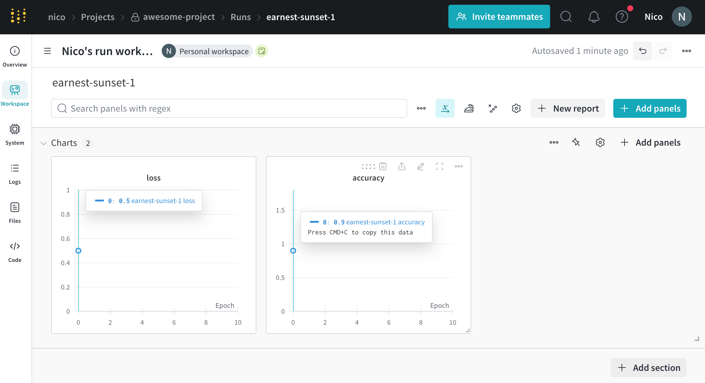 The URL W&B returns in the terminal to redirects you to the run’s workspace in the W&B App UI. Note that the panels generated in the workspace corresponds to the single point.