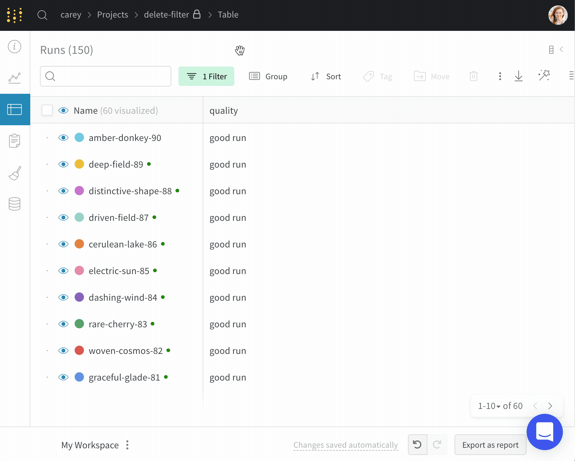 추락한 run을 숨기고 싶으신가요? 짧은 run이 표를 채우고 있나요? 그룹 프로젝트에서 자신의 작업만 보고 싶으신가요? 필터로 노이즈를 숨깁니다. 우리가 추천하는 몇 가지 필터: