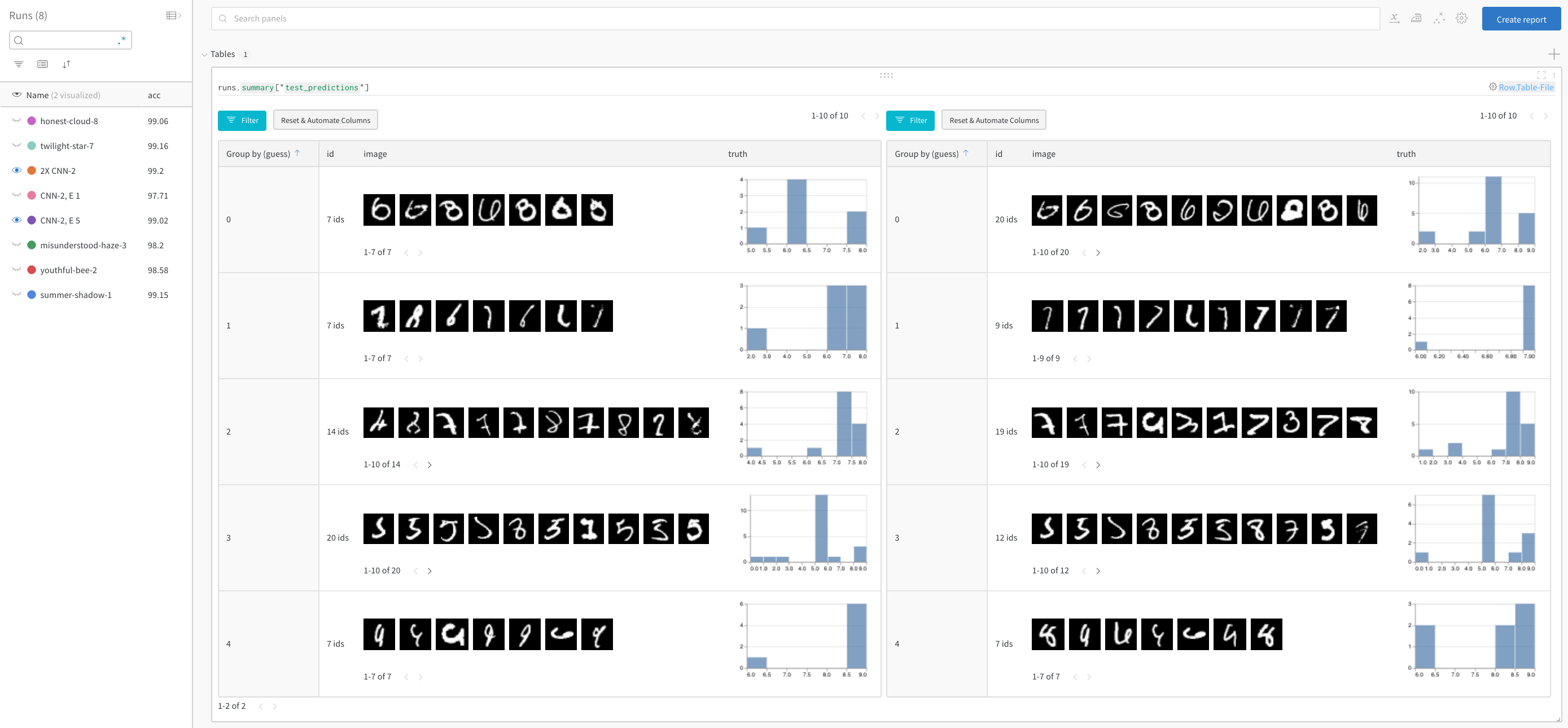 For every epoch, run a training step and a test step. For each test step, create a wandb.Table() in which to store test predictions. These can be visualized, dynamically queried, and compared side by side in your browser.
